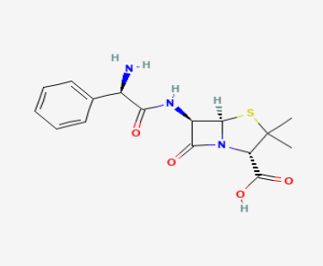 Ampicillin: (2S,5R,6R)-6-[[(2R)-2-amino-2-phenylacetyl]amino]-3,3-dimethyl-7-oxo-4-thia-1-azabicyclo[3.2.0]heptane-2-carboxylic acid
