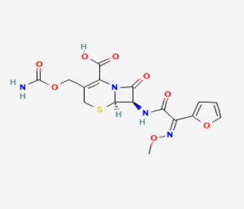 Cefuroxime: (6R,7R)-3-(carbamoyloxymethyl)-7-[[(2Z)-2-(furan-2-yl)-2-methoxyiminoacetyl]amino]-8-oxo-5-thia-1-azabicyclo[4.2.0]oct-2-ene-2-carboxylic acid